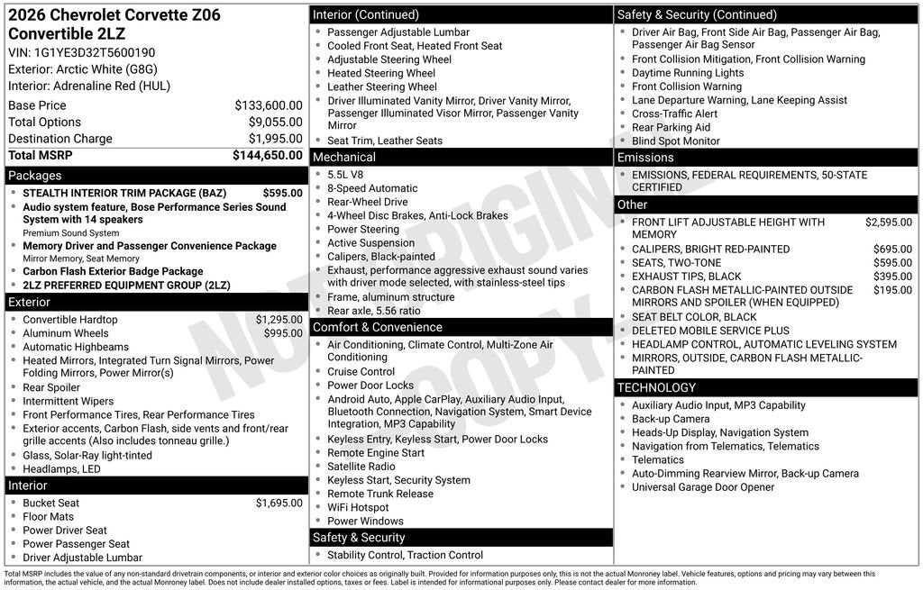 CARFAX One-Owner. Clean CARFAX. 2026 Chevrolet Corvette Z06 in Arctic White vehicle highlights include, **CLEAN CARFAX**, **ONE OWNER**, **STILL UNDER FACTORY WARRANTY**, **ALLOY WHEELS**, **LEATHER**, **KEYLESS ENTRY**, **MULTI-ZONE CLIMATE CONTROL**, **Bluetooth®**, **BACK UP CAMERA**, **POWER SEATS**, ** MULTI FUNCTION STEERING WHEELS**, **SATTALITE RADIO**, **REMOTE START**, **COOLED &HEATED SEATS**, *PREMIUM SOUND SYSTEM**, **REAR PARKING AID**, **KEYLESS START**, **MANY MORE OPTIONS**. Arctic White 2026 Chevrolet Corvette Z06 2LZ